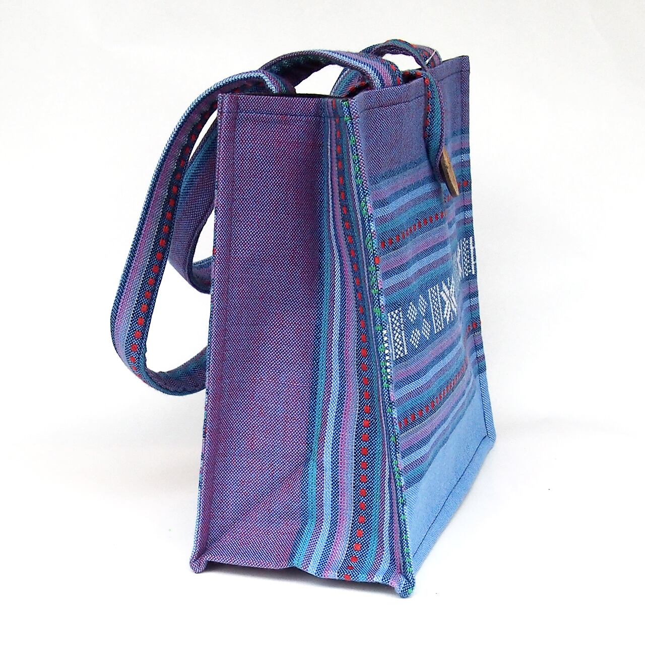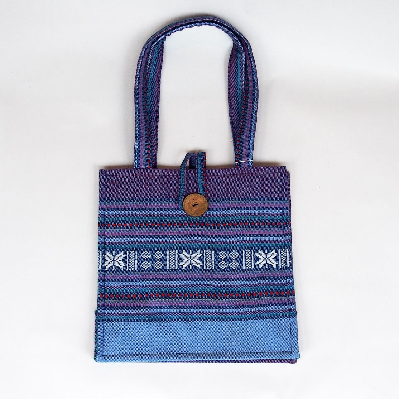 ・少数民族の布生地を使用したハンドバッグ。 ・シックなブルー系のカラーを組み合わせたデザイン。 ・留め具はボタン 幅:22.5㎝ 高さ:22㎝ マチ:11㎝ 重さ:70g 素材:布 産地:ベトナム